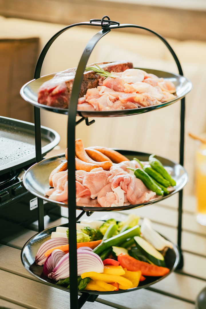 そして、3段スタンドに盛られて登場したのは、「BBQ盛り合わせ」! 最上段と二段目には、サーロインステーキ、国産豚モモ肉、国産若鶏モモ肉、粗挽きウィンナー、チョリソーが。その下の段にはアスパラやズッキーニ、パプリカ、長芋など11種類の野菜が盛り合わせになっています。精肉(お肉類)は、主に地下1階、地下2階でお取り扱いのものを使用しているので、鮮度と品質はお墨付き。