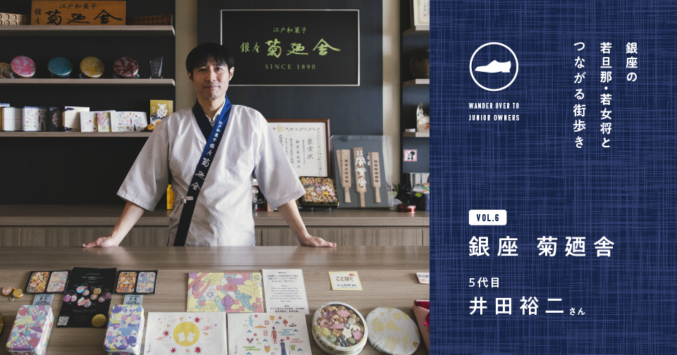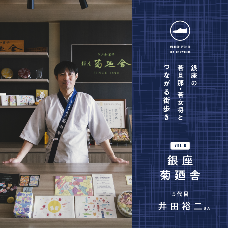 銀座で営みを続ける「名店の若旦那・若女将」にナビゲーターとして登場していただき、銀座の街の魅力から長年紡いできたお店の歴史をインタビュー。若旦那・若女将がつながるお店・場所などもお聞きしたので、銀座街歩きも楽しんでみたい。第6回は、100年以上続く看板商品「冨貴寄(ふきよせ)」を再ブレイクさせた、江戸和菓子屋「銀座 菊廼舎(ぎんざきくのや)」の5代目・井田裕二さんにお話をお伺いします。