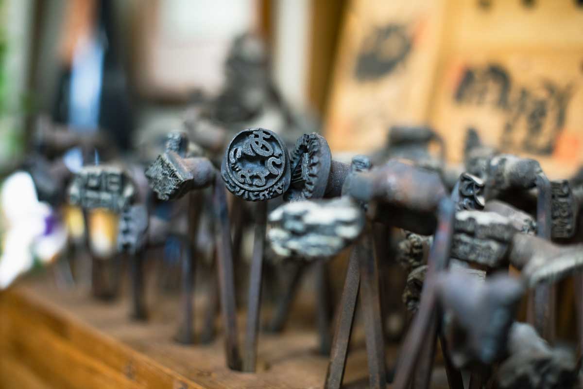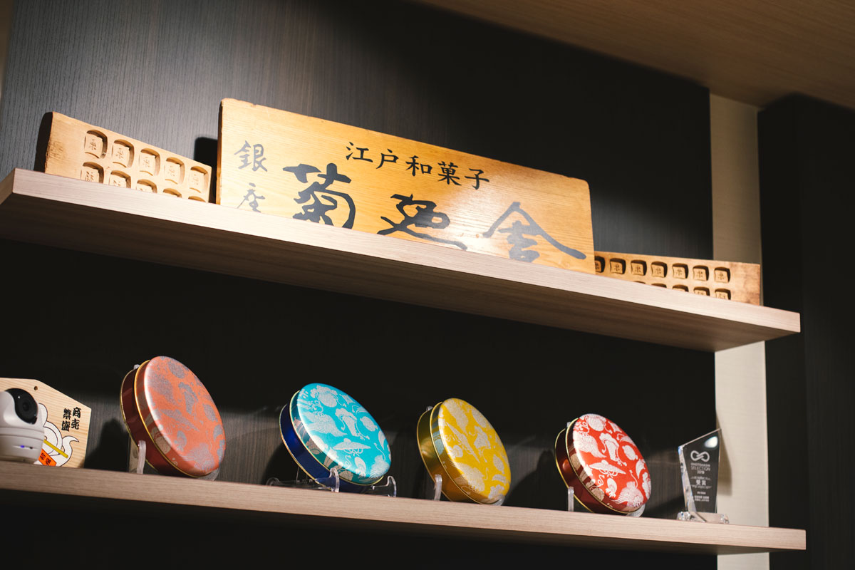 本店は銀座で唯一の石畳が敷かれた趣のあるあづま通りに。このあたりは着物関連の店舗が多く、今もなお画廊や喫茶店など歴史あるお店が点在します。銀座 菊廼舎も店内には135年の歴史が感じられるアイテムが展示されています。なかでも目を引くのが、干菓子や落雁、金平糖など「冨貴寄」を作る際に使用されてきた木型。