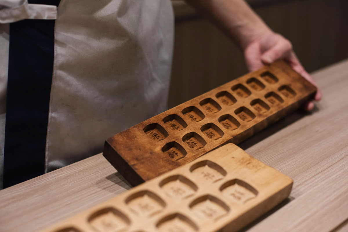「カウンターに展示しているのは、3代目が1950年代頃に使用していたもの。カラフルなお菓子を作る際に使われ、美しいデザインの『冨貴寄』を生み出してきた大切な道具です。現在は機械がメインですが、富士山モチーフの菓子など、特注の菓子作りには今も木型が活躍しています」