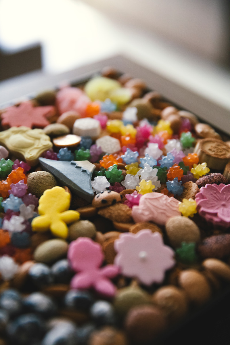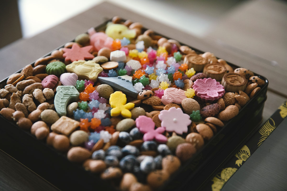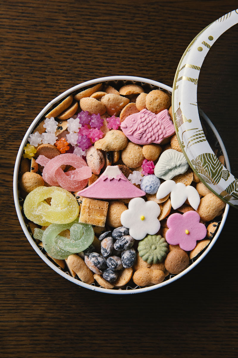 いまや来店客の9割が求めるという、5代目の手でさらに美しく進化を遂げた「冨貴寄」。バターを使用せず小麦粉と砂糖と卵のみで作られた和風クッキーの上には、カラフルな金平糖や日本の四季を表現した和三盆をはじめ、落雁、黒豆、ピーナッツ、結び寒天など20~30種類、色違いを含めると40~50種類の干菓子が隙間なく詰め込まれています。