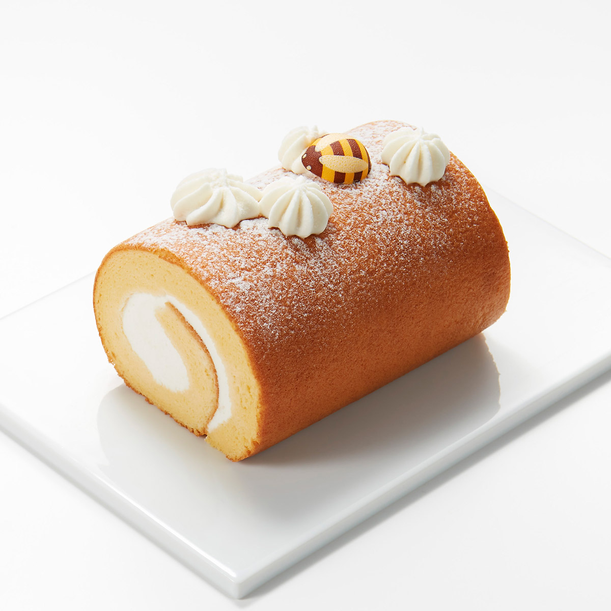 「銀座はちみつを使用した、サステナブルなロールケーキです。こっくりと深い甘みのはちみつをたっぷり使用したクリーム、米粉を使用したモチモチの生地が印象的。ハチのチョコレートをトッピングした、はちみつ感のある楽しいビジュアルもポイントです」