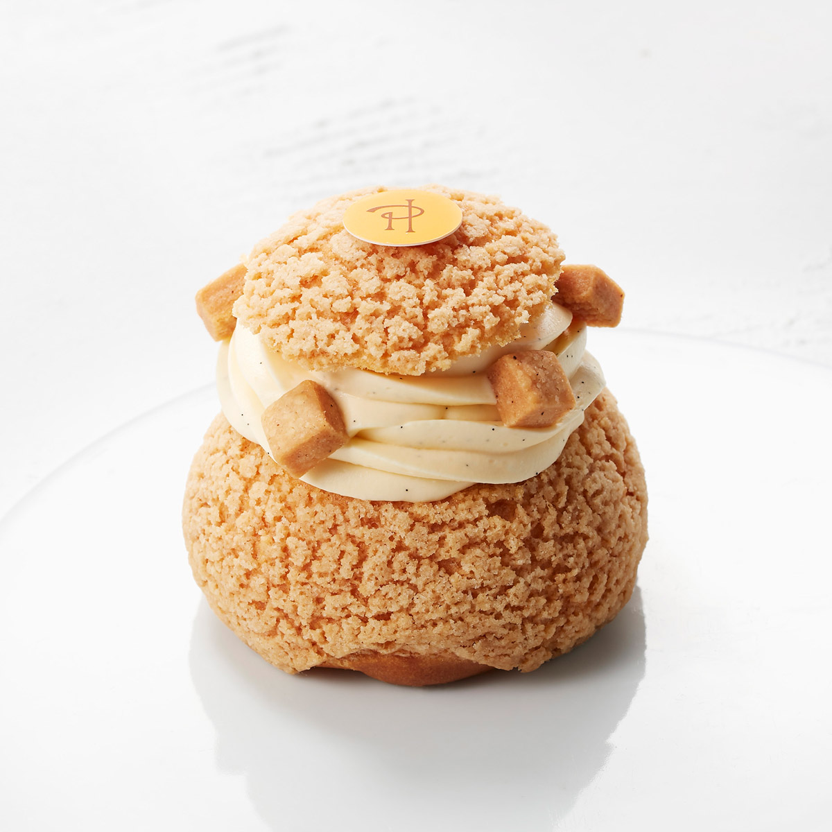 「人気パティスリーから、5年以上も世に出ていないという幻のシュークリームが復刻します。上質なバニラクリームと、さっぱりとしたマスカルポーネクリームが相性抜群です。風味豊かなしっとりとした生地に、ザクザクのクランブルの食感のハーモニーが楽しめます」