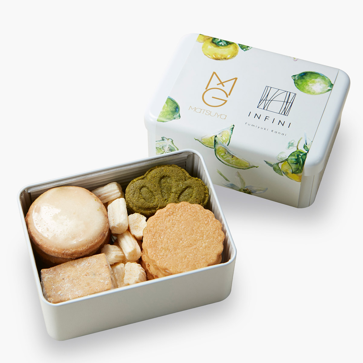「九品仏に本店を構える金井史章氏のパティスリー、アンフィニのクッキー缶です。松屋が掲げる地域共創を体現し、今回は土佐ベルガモットと高知の柚子を使用した爽やかなフールセックをぜひ目当てに。松屋銀座限定の抹茶サブレを詰め合わせました」