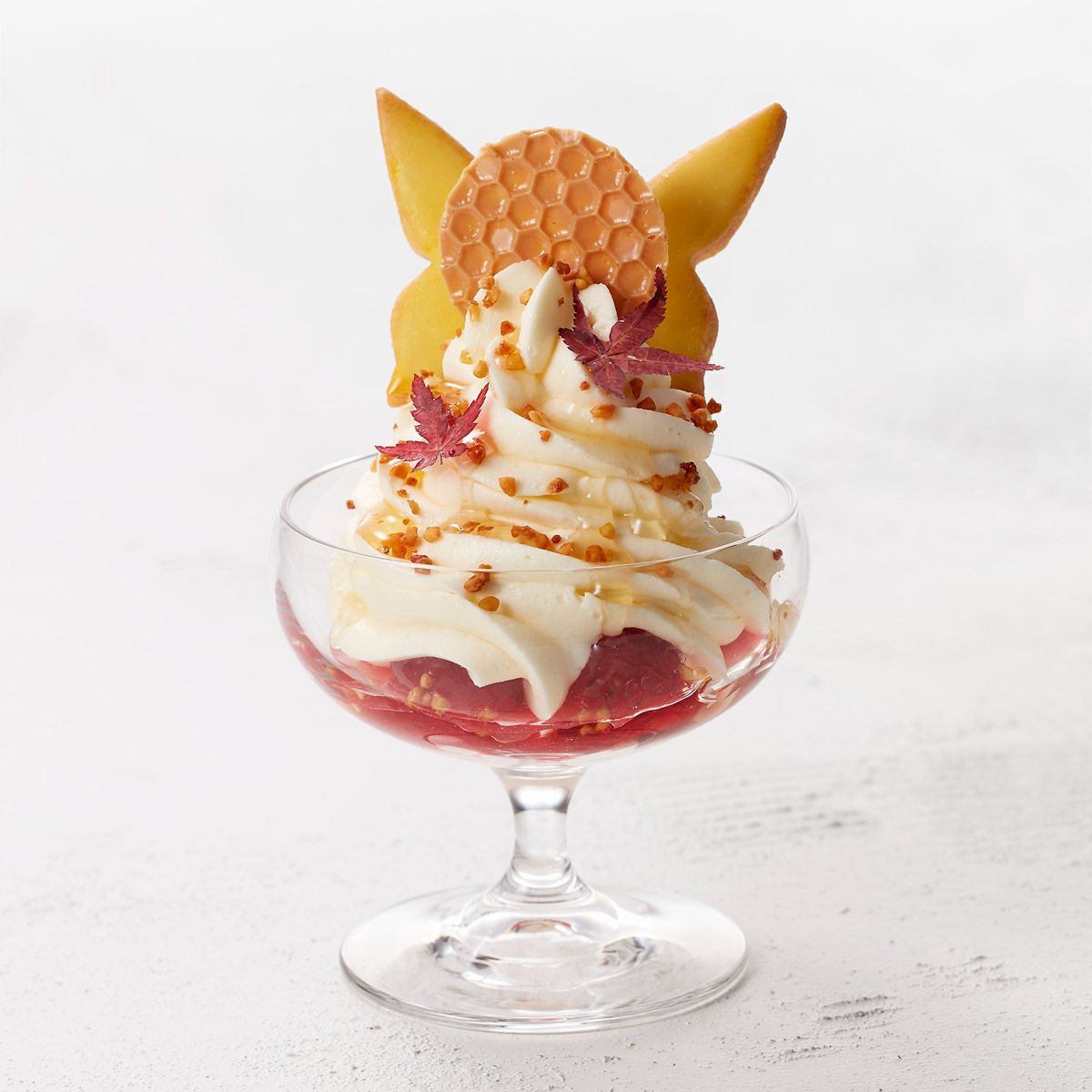 「ラグジュアリーホテル『ザ・ペニンシュラ東京』のエグゼクティブペストリーシェフが監修した、銀座はちみつを使ったパルフェが秋バージョンでの登場です。蜂の巣模様とチョウチョのような形の焼き菓子がかわいく、もみじのあしらいで秋らしさ満点。イートインのみの提供です」