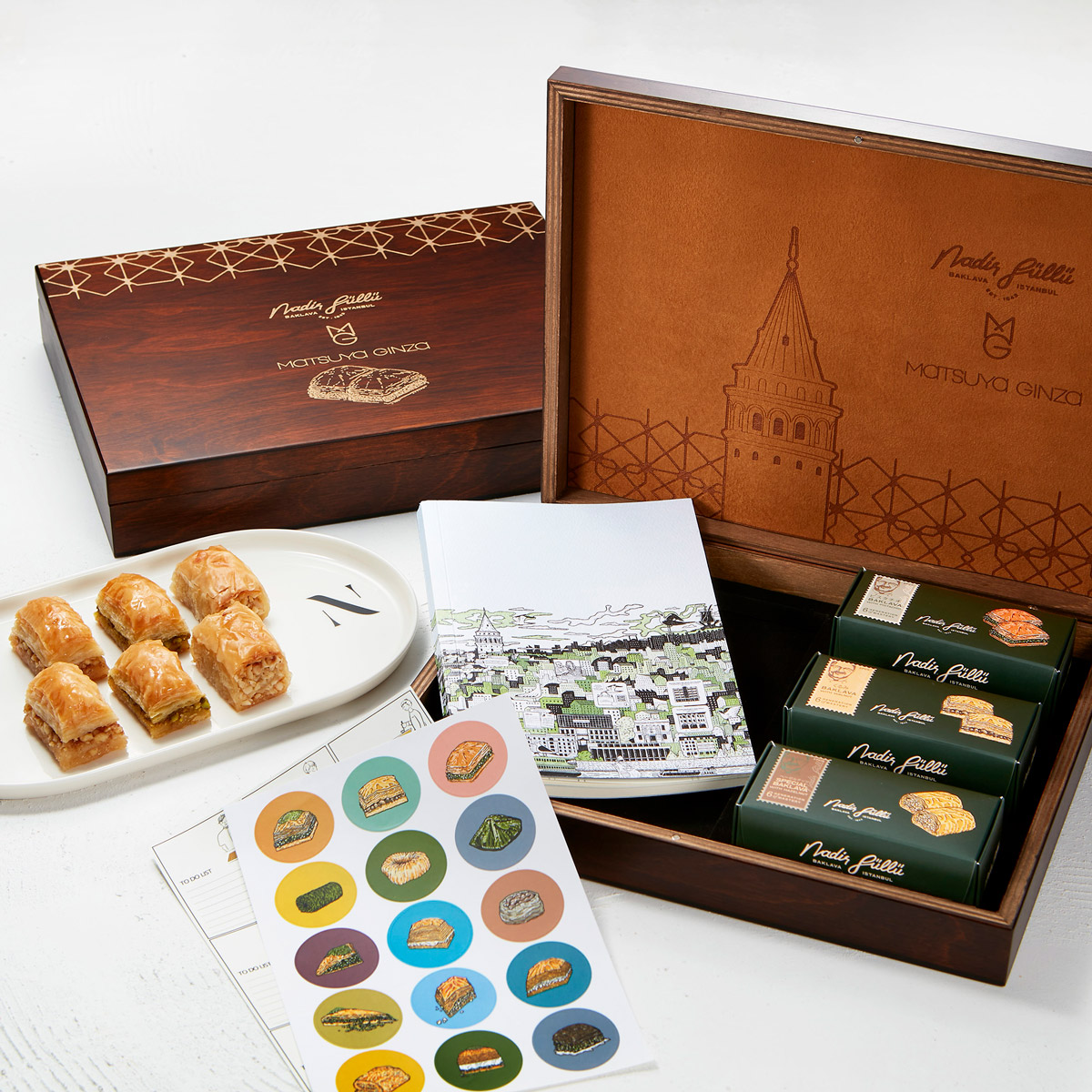 「トルコの伝統的な焼き菓子、バクラヴァ。ピスタチオ、くるみ、ヘーゼルナッツの3種(各2個入り)と限定デザインのノートを、松屋銀座開店100周年を記念した高級感あふれる木箱に詰めました。特別感があり、お客様の記憶に残る一品です」