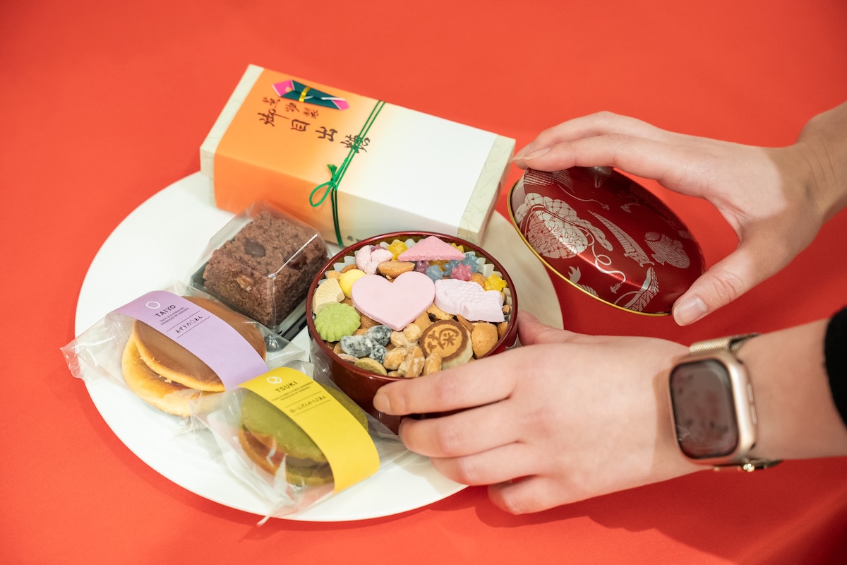 まず詰め合わせには、創業400年を誇る老舗の〈萬年堂本店〉の「御目出糖」3個入り1箱と、今年で創業135周年、創業当時から銀座の地でのれんを掲げる〈銀座菊廼舎〉の「冨貴寄 ハート日和」、そして、著名人にも愛される〈ぎんざ空也〉の新ブランド〈空いろ〉から、どらやき「たいよう」と、クッキー生地でこしあんをはさんだ「つき」をセットにしました。また、〈萬年堂本店〉と〈銀座菊廼舎〉は、銀座本店で使用できるクーポンも付いています。