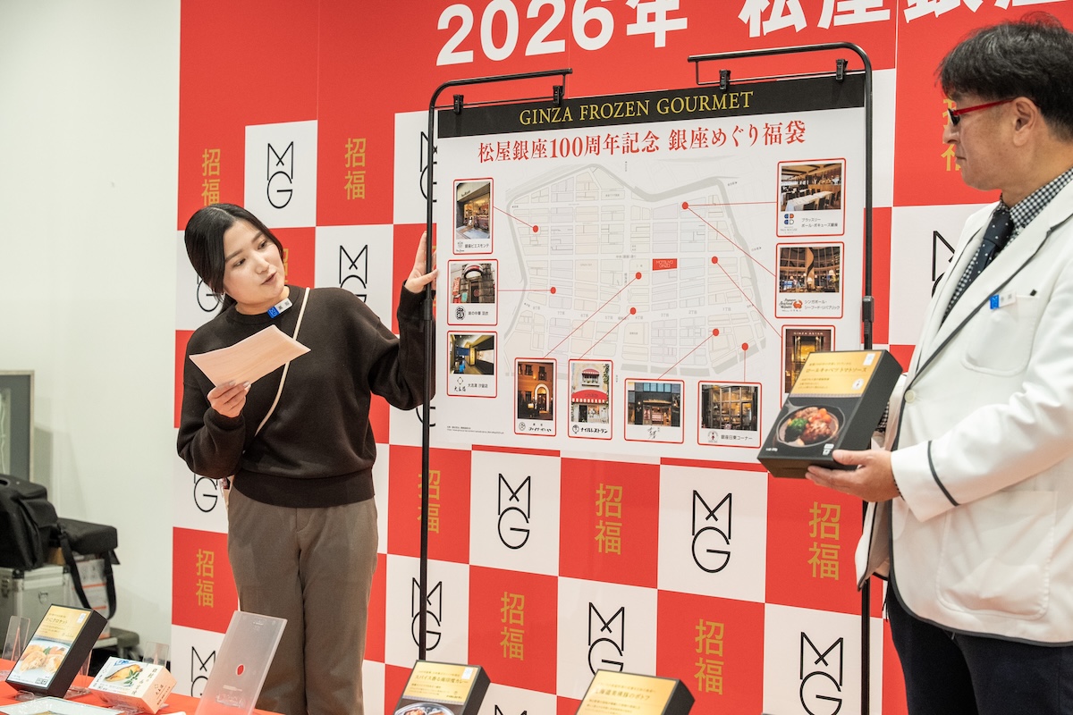 最初の福袋は食品部から。松屋銀座では、高級冷凍食品シリーズ「GINZA FROZEN GOURMET」を販売しています。発売から3年、銀座の老舗や人気店のハイクオリティーな味わいを家庭でも気軽に楽しめると好評です。100周年を迎えた今年、その記念として、なんと、「GINZA FROZEN GOURMET」で展開する銀座の名店の冷凍食品10点と、同店のペアランチチケット10店舗がセットになった福袋を作りました。