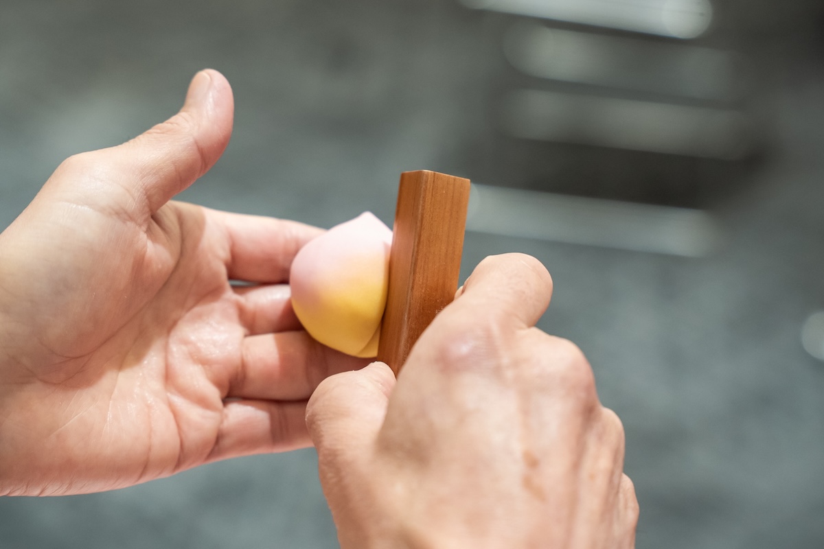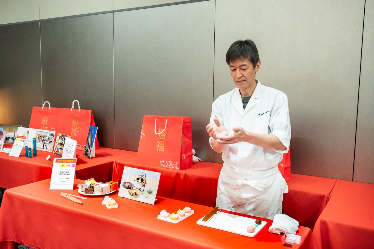 内覧会では〈清月堂本店〉の工場長・堀内誠さんが練り切りづくりを実演。淡く色付けされた白あんがみるみるうちにかわいらしい練り切りに変化する様子は見ていても飽きません。