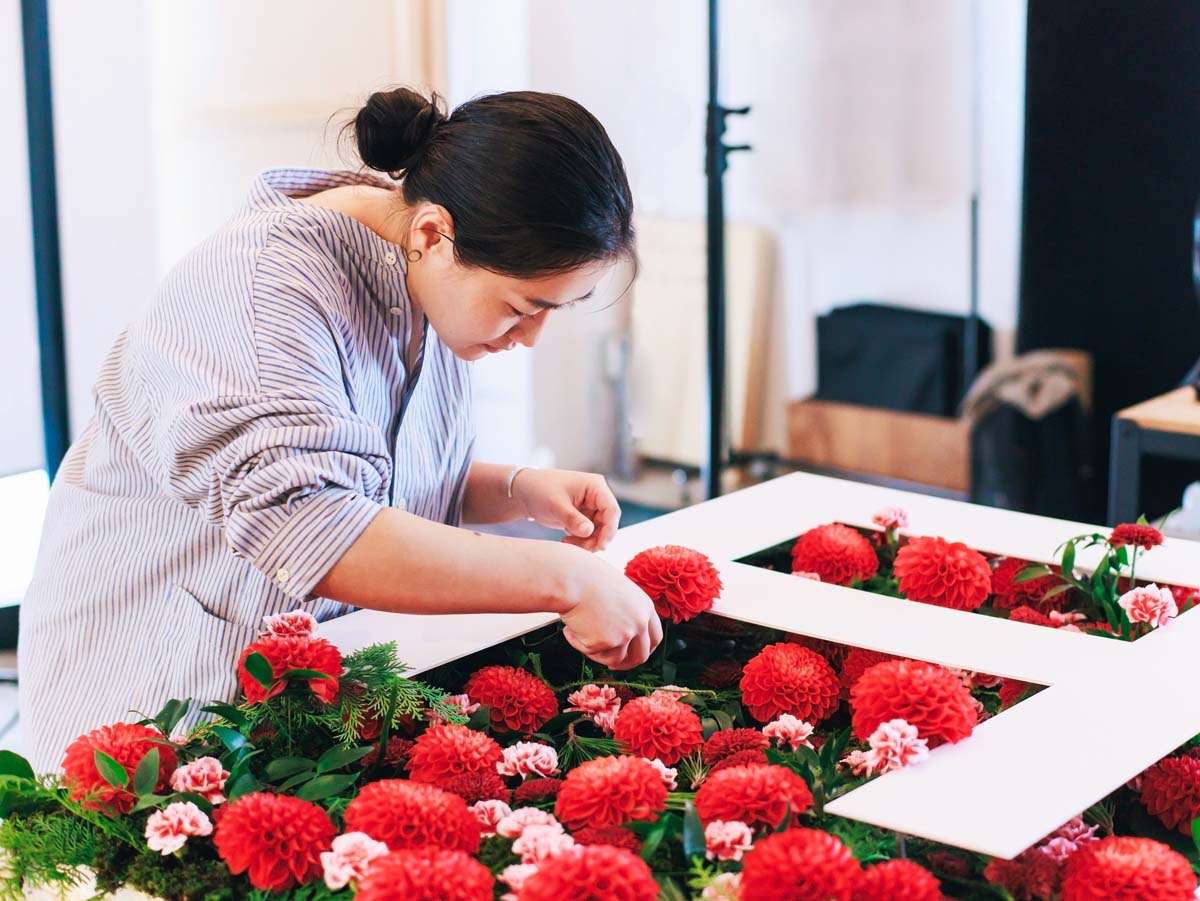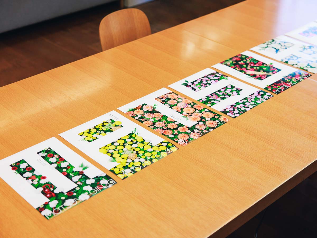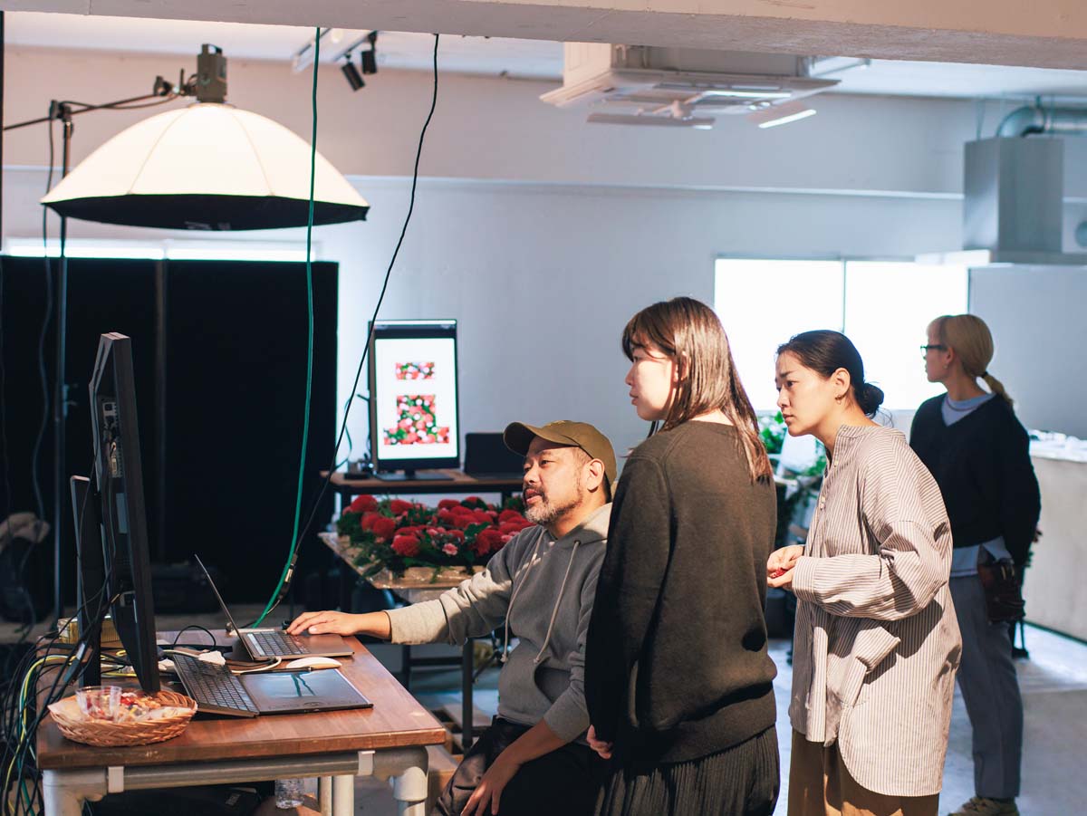 佐藤さん:写真はデジタルですから、加工や合成もしますが、基本的には実写を尊重しています。現場ではフラワーコーディネーターが敷き詰めた苔や葉っぱの上に花を一つひとつ活け、さらにその上にアルファベットの形に切り抜いた白いボードをのせて撮影。今はAIでなんでもできるような時代ですが、深みや細やかさを重視するなら、やっぱり手作業やアナログ的な手法が大切なんです。
