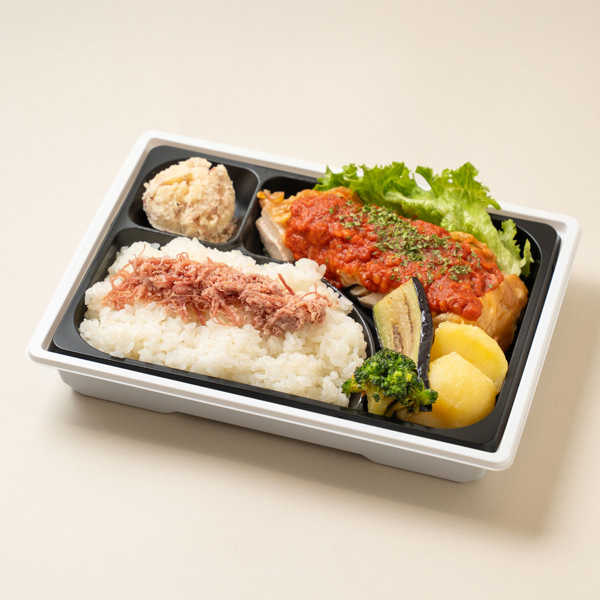 もうひとつ、ディッシュ・アップ千駄木腰塚と作り上げたお弁当には熊本県産品のあか鶏を取り入れた一品が詰められています。阿蘇の伏流水やハーブ飼料で育った熊本あか鶏は、赤みがかった肉質が特徴で味がしっかり濃厚。こちらに千駄木腰塚が手がけるレストラン「Bistro1048」で人気のトマトソースを合わせています。こっくりと深い、唯一無二の味わいになったと思います。シグニチャーのコンビーフをたっぷり味わえるのも嬉しいですよね。