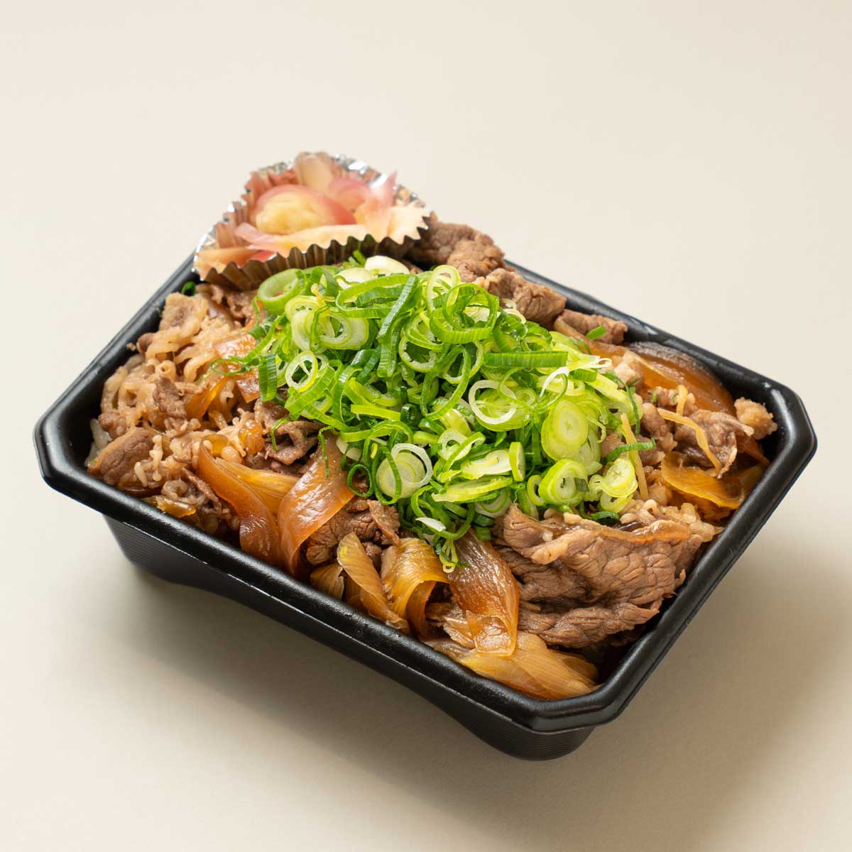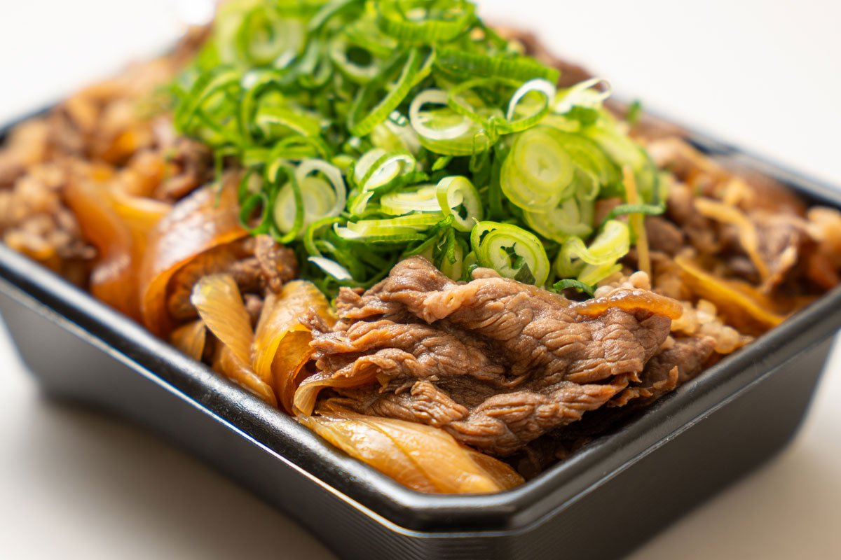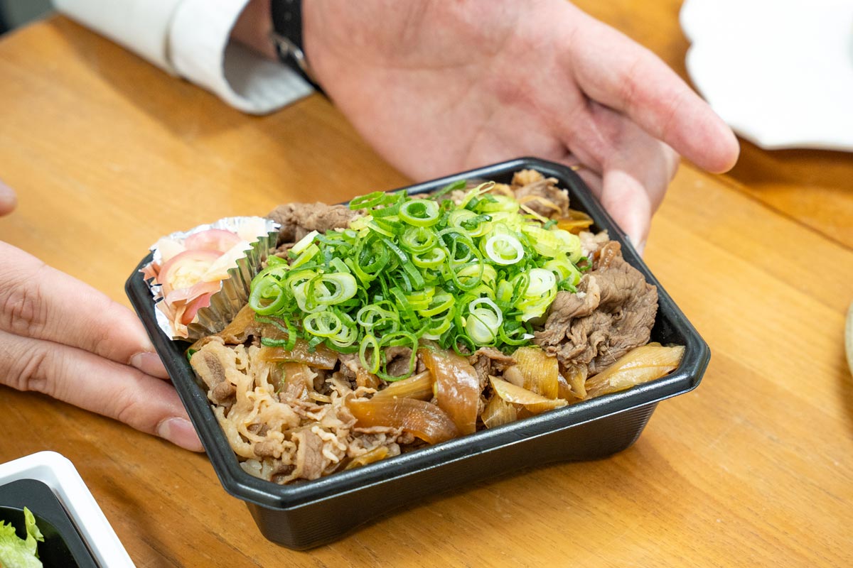 最初に、熊本のあか牛を使って三友居の牛丼を企画しました。三友居は京都発祥の茶懐石のお店ですが、もう出汁からしてすごくおいしい。当初焼くことを検討してましたが、いろいろと試してみた中で、あか牛は赤身にうまみが詰まっているお肉なので、煮ることでそのよさがより伝わるだろうと話し合って牛丼に辿り着きました。九条ねぎをたっぷりかけて、三友居らしさもしっかり感じられる仕上がりです。