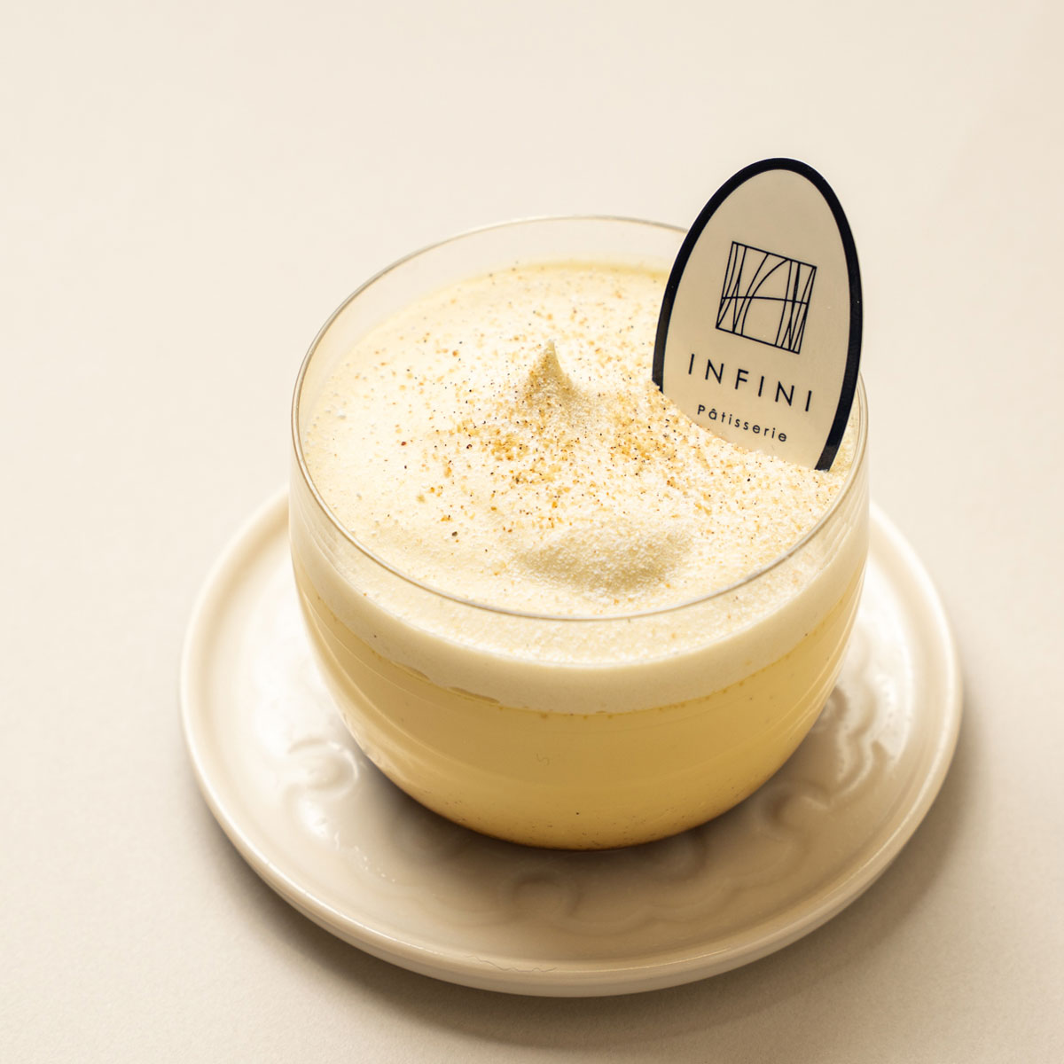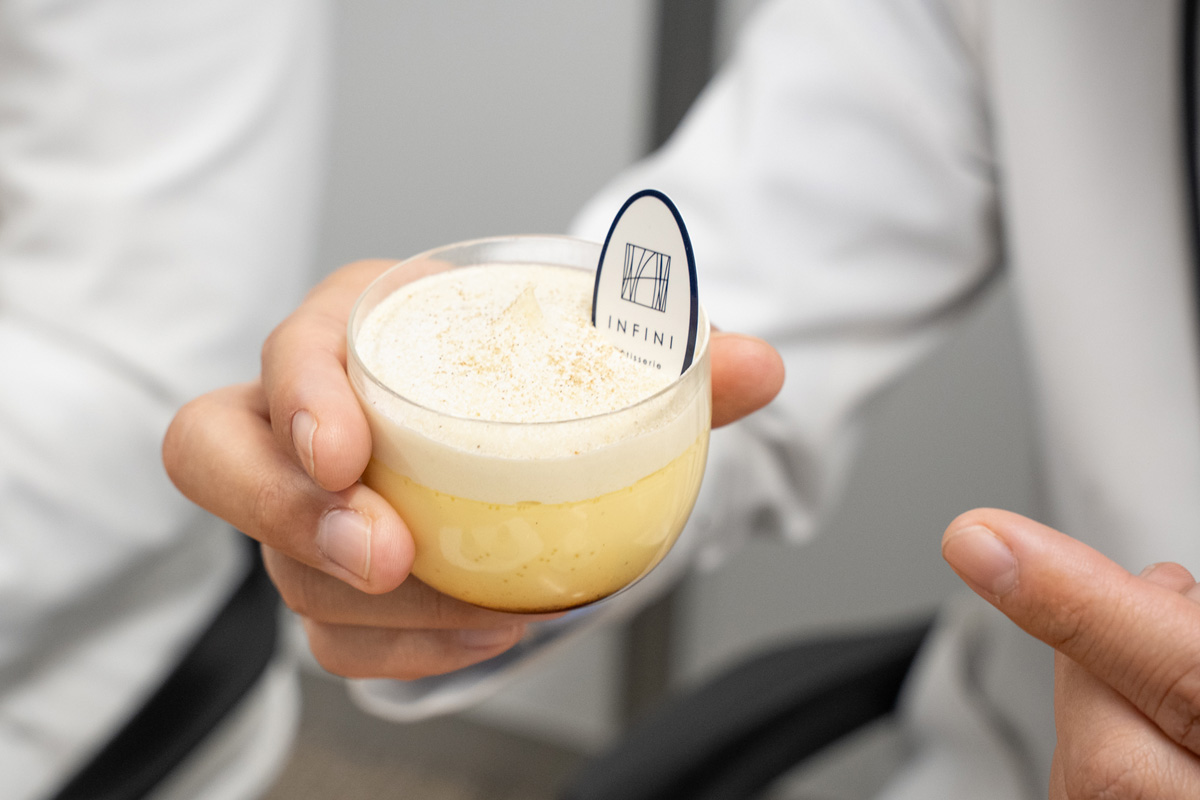 こちらのアンフィニの「ジャージー乳と蜜焼き芋のクリーミープリン」は、プリンに熊本のジャージー乳、その上のクリームに紅はるかの蜜焼き芋を使っています。普通の牛乳より甘みを強く感じるジャージー乳のプリンはとびきりクリーミーな仕上がり。低温でじっくり加熱した蜜焼き芋を使ったクリームにもしっかりした甘みがあります。そんなふたつの素材をバランスよくつなぐ隠し味が、トッピングされているカルダモン。爽やかで上品な香りと風味で、全体をすっきりと引き締める絶妙なアクセントになっています。悩みに悩んでたどり着いた、カルダモンの存在感をぜひ確かめていただきたいです。