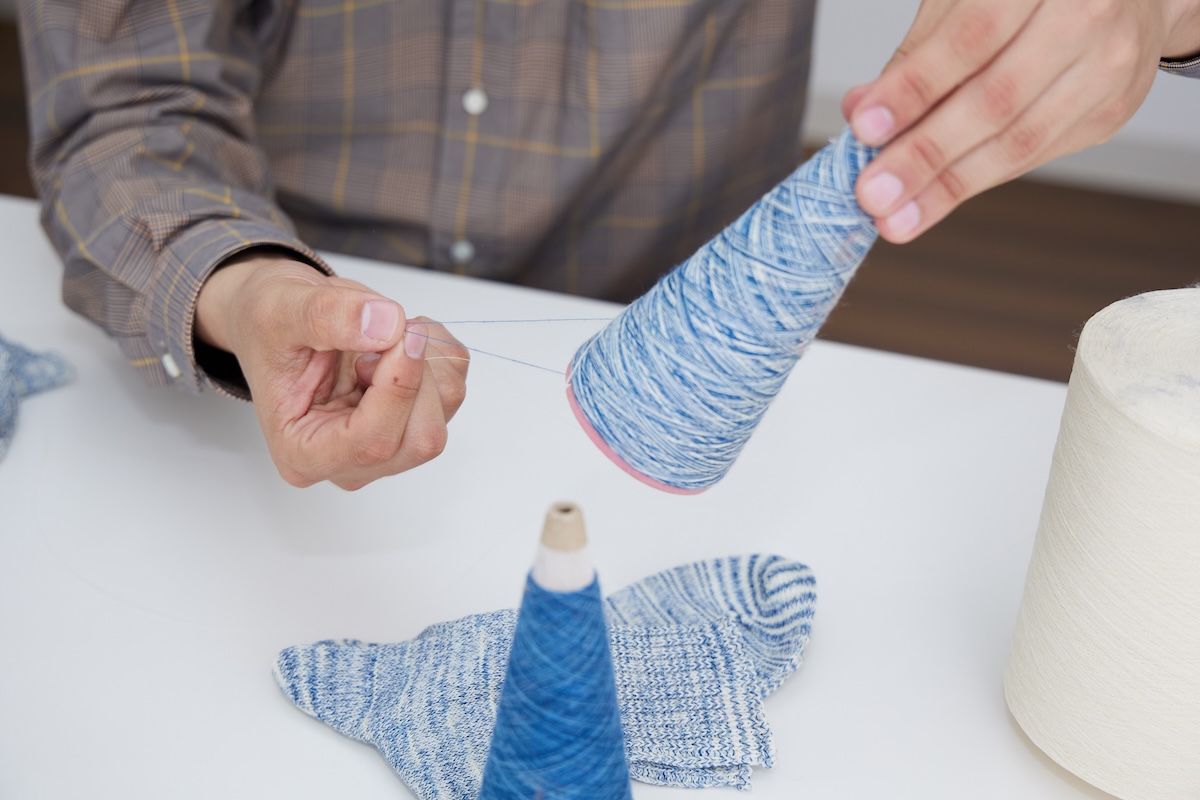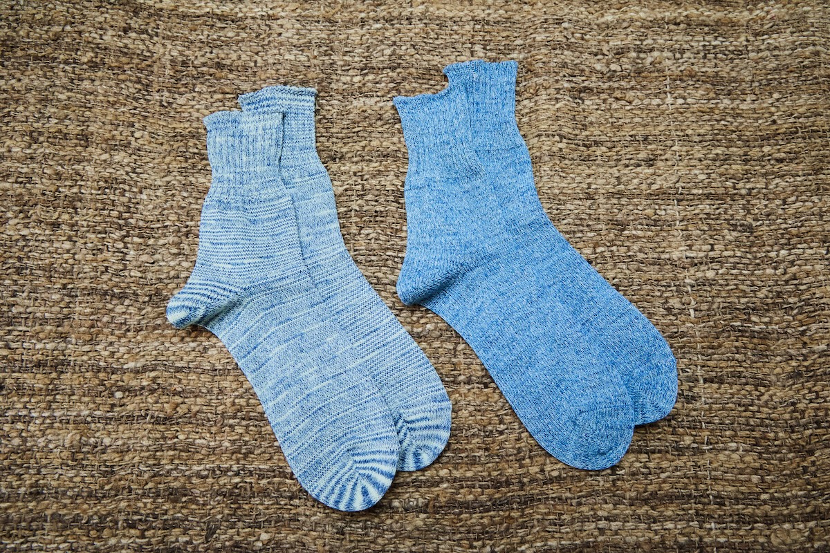 和紙とオーガニックコットンを撚った糸を、藍で段染めする。そのゆらぎのある藍色の糸で作る靴下は、まさに一点物の風合い。100周年記念商品として登場します。