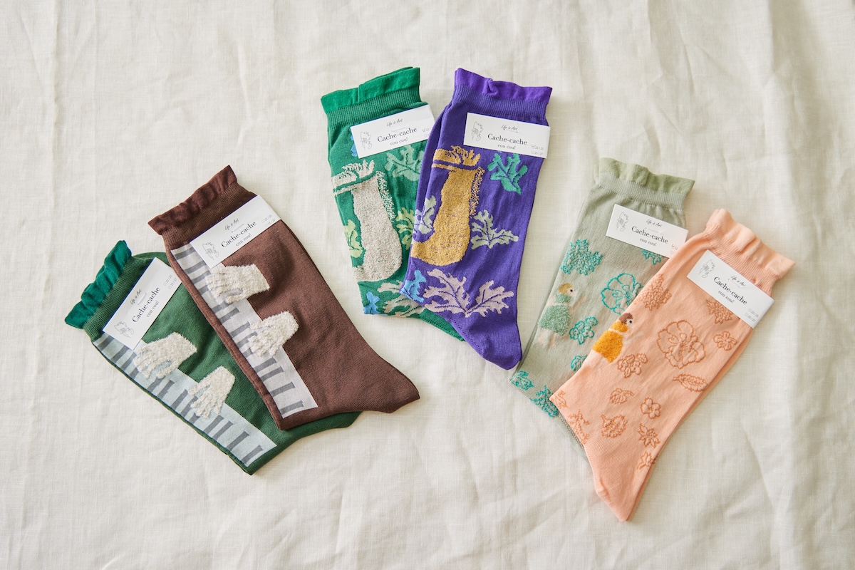 アーティストの森ひろこさんとコラボした「Cache-cache cou cou!(カシュ・カシュ クク)」では、デザインによって微妙に幅を変えたり、ポイントとなる部分の素材を目立つ糸にしたり、ユニーク。足元を愛らしく彩ります。